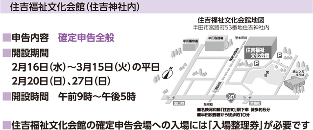所得税の還付を受けるための申告書は、源泉徴収票などの必要書類が準備できていれば、1月4日(火)~1月14日(金)は半田税務署1階で、1月17日(月)~2月15日(火)は住吉福祉文化会館で申告書を作成することができます。入場には入場整理券が必要となります。詳しくはこちらをご覧ください