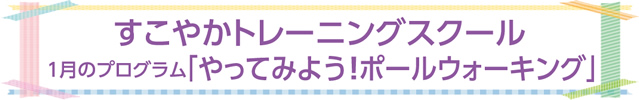 スポーツ村すこやか町民開放日(毎月第3日曜日)に合わせ、トレーニングスクールを行います。今回から3回続けて「安全で良い姿勢」のプログラムを中心に、ポールウォーキングに取り組みます。楽しく健康づくり・体づくりをしましょう。