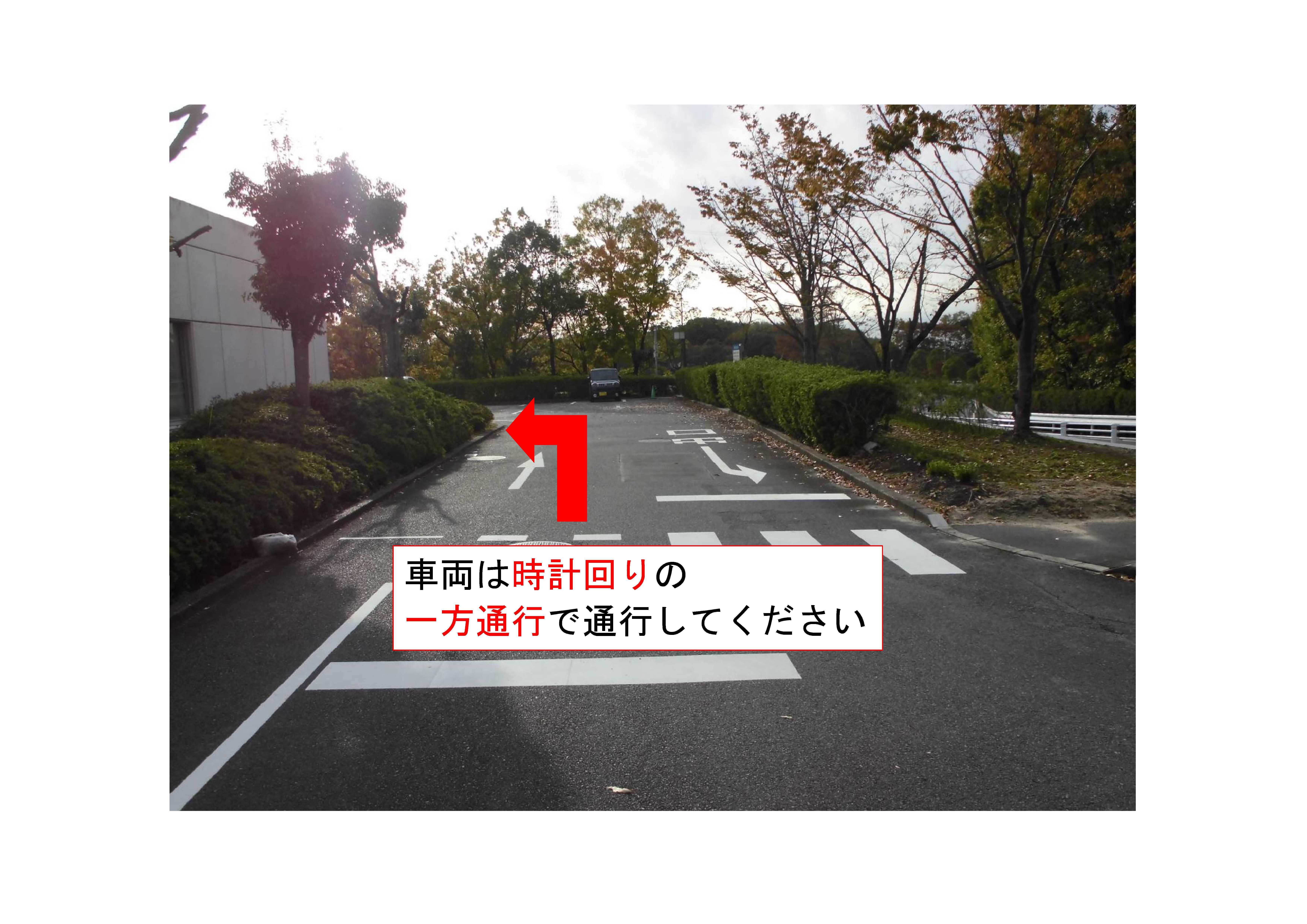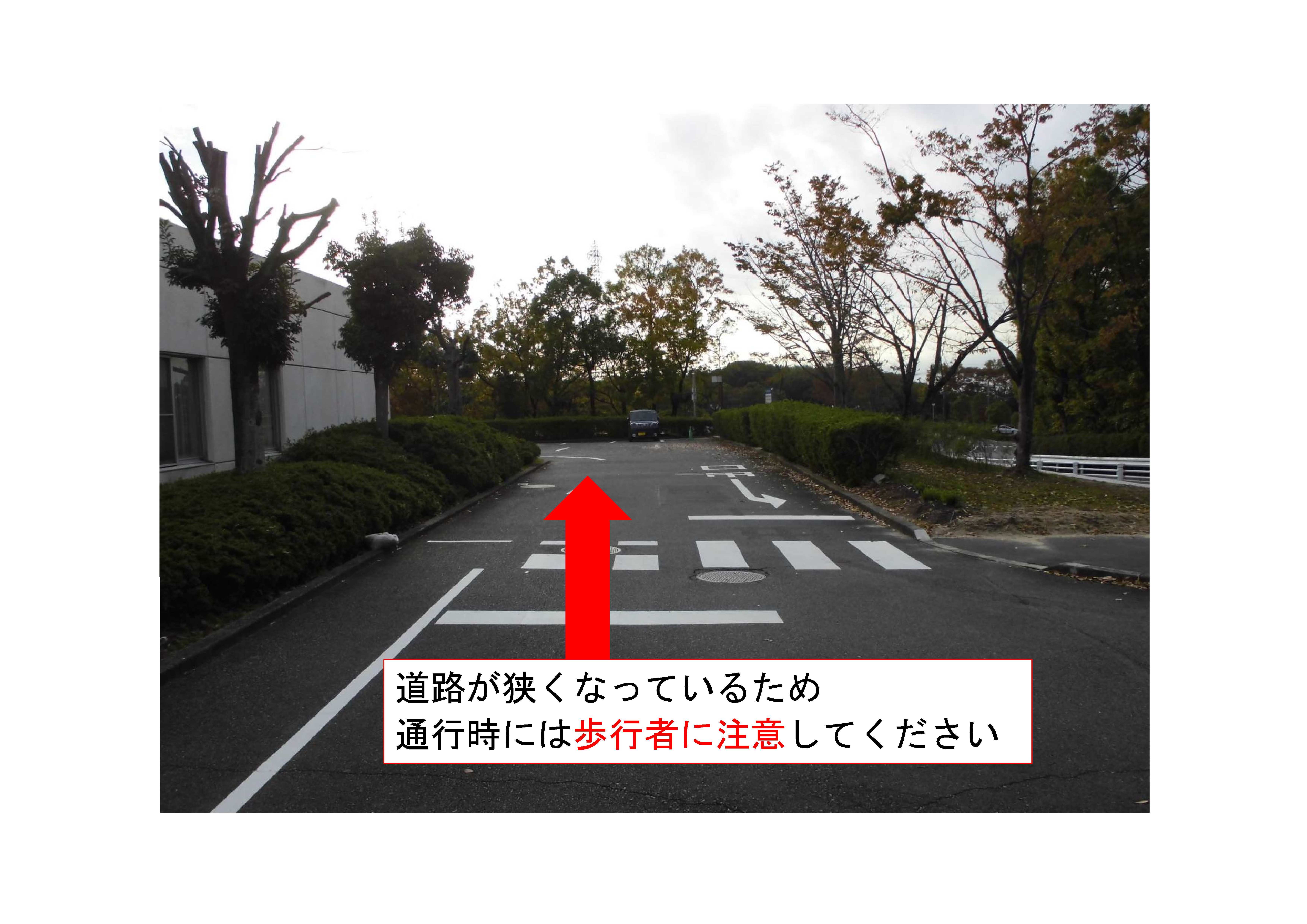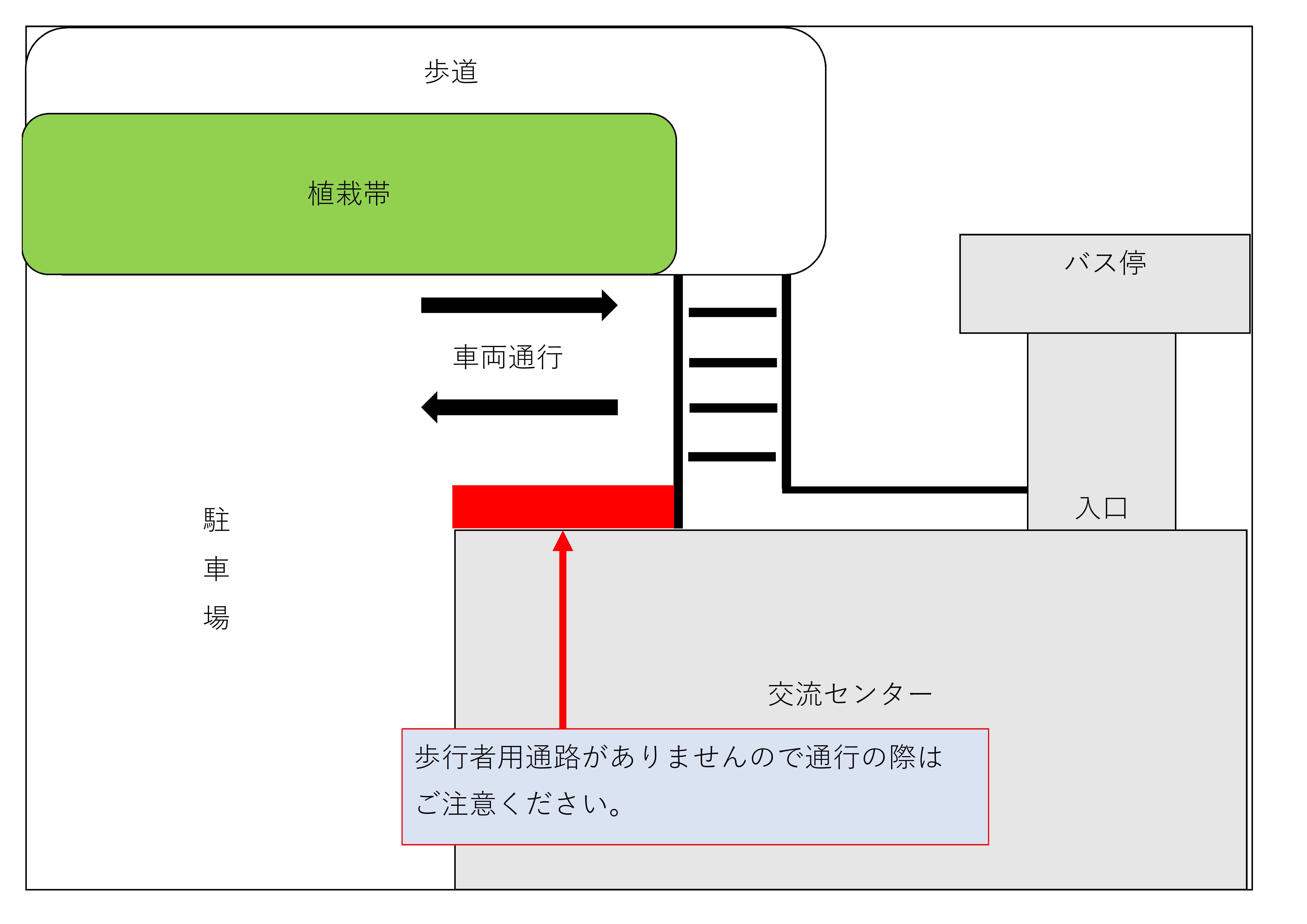 交流センター駐車場から交流センター入り口までの歩行者用通路が横断歩道までしか設置されていませんので、駐車場まで通行する際は歩行者に十分お気を付けください。