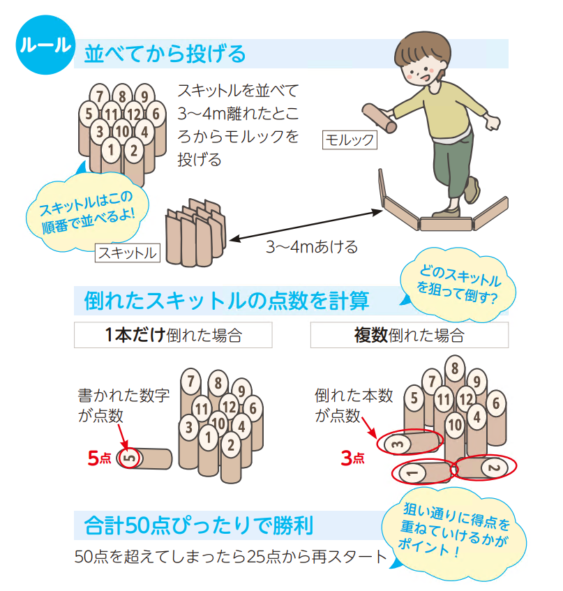 1から12の数字が描かれたスキットル(木製のピン)に、モルック(木製の棒)を当てて得点を競います。ルールはシンプルですが、どのスキットルを狙えばいいのか戦略を考え、狙い通りに得点を重ねていけるかがモルックの面白いところです。