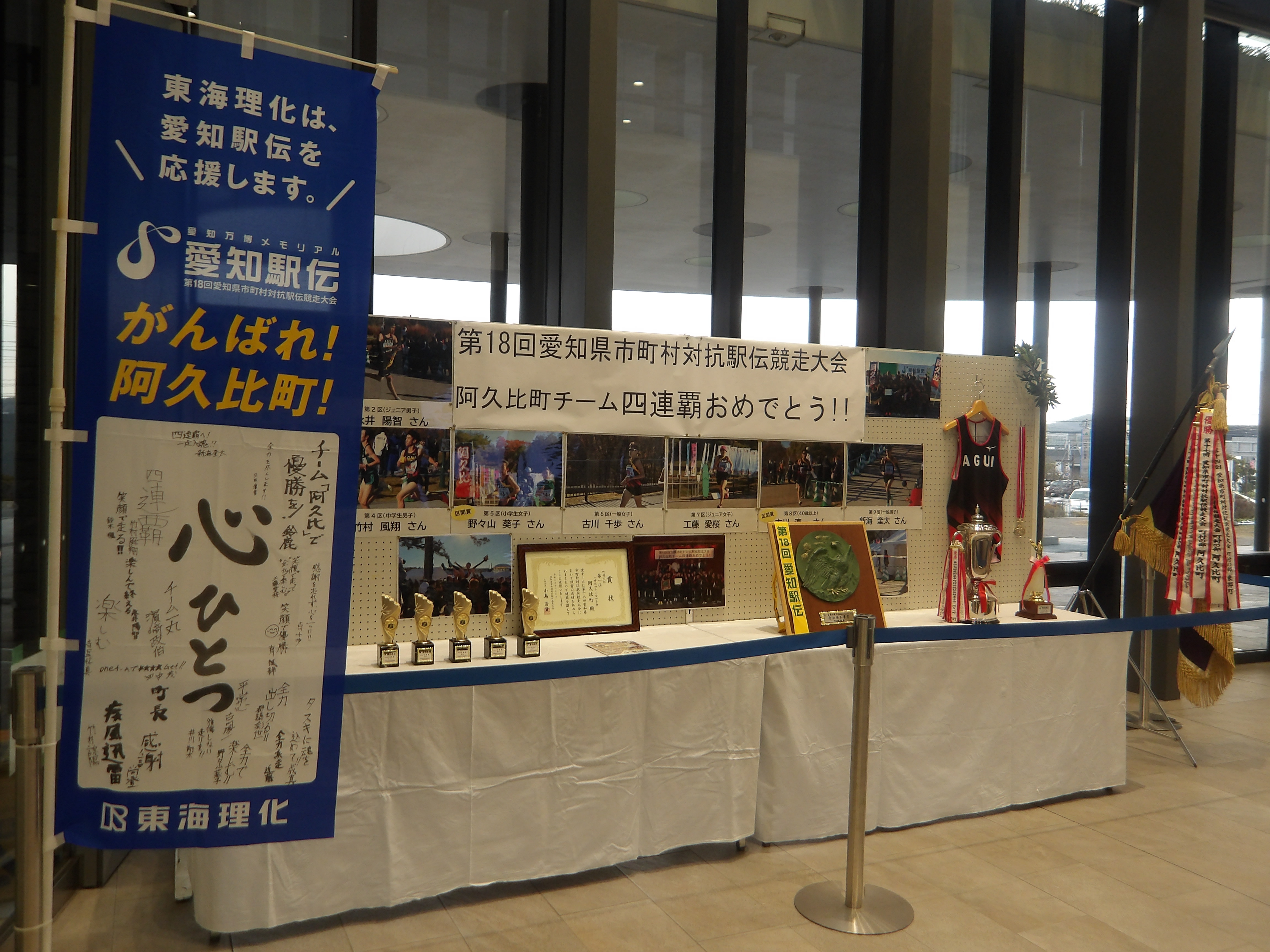 役場庁舎1階ロビーにて、令和8年1月中旬まで愛知駅伝の優勝展示を行っています。ぜひ足をお運びください。