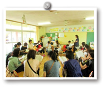 年長児の懇談会を行い、各家庭の子育ての悩みを聞き、家庭と保育園とで一緒に子育ての目標を確認しました。保護者の方から、「小学校に上がるときのために家庭でできることは何かありますか」など積極的に質問が挙がりました。