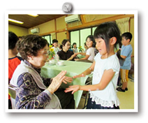 毎月行われる宮津団地のサロンに年2回年長児が招待され交流に行っています。今回も7月17日に年長児33人がサロンを訪問し、おじいちゃんおばあちゃんと一緒にふれあい遊びをして楽しみました。「楽しかったよ」「ありがとう」と声を掛けてもらい、子どもたちは地域の方に見守られている安心感や喜んでもらえたうれしさを感じ、改めて地域の方への親しみを持つよい機会となりました。