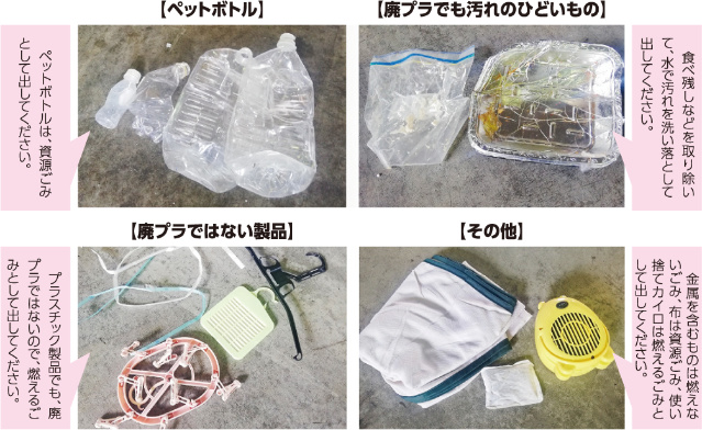 次のごみは、町が収集した廃プラ(プラスチック製容器包装)のごみ袋の中に混入されていた廃プラではないごみの一例です。廃プラとして出されたごみの中には、約20%異物が混入しています。廃プラではないごみは、さらに費用をかけて処理することになります。正確に分別してごみの減量化にご協力をお願いします。