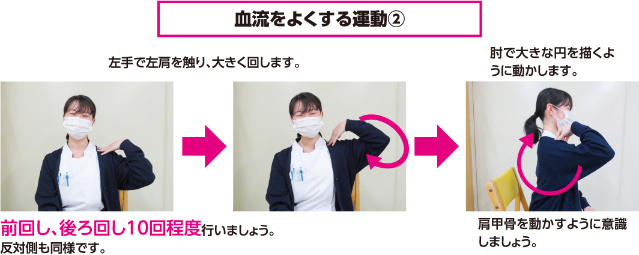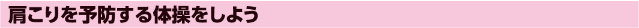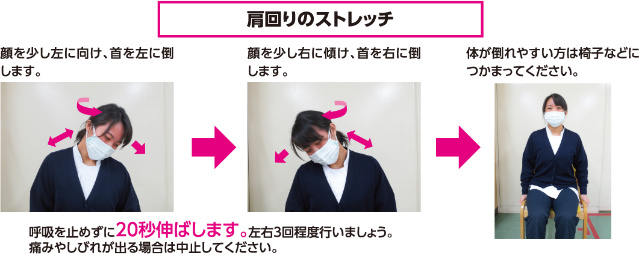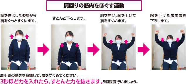 肩回りの筋肉を伸ばしたり、凝り固まった筋肉をほぐすために力を入れたり抜いたりする運動をすることで肩こりを改善・予防しましょう。