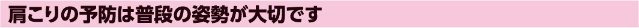 姿勢が悪いと肩こりだけでなく腰痛や膝関節痛などさまざまな悪影響があります。普段から自分自身の姿勢を意識することが大切です。ずっと同じ姿勢でいるときは立ち上がって伸びをするなど姿勢を変えることを心掛けてください。