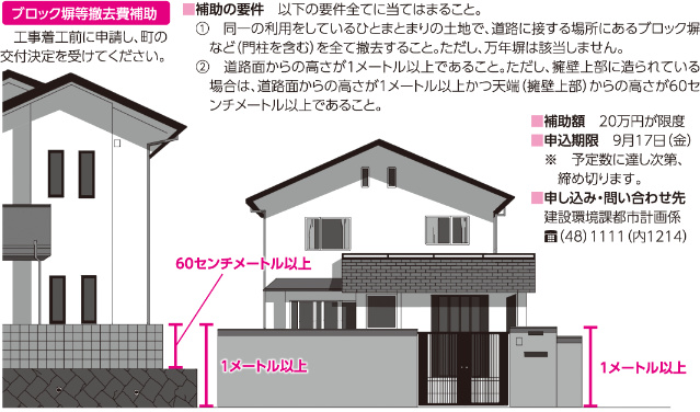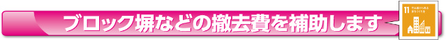 町では、ブロック塀など(門柱を含む)の倒壊による被害や避難時などの通行の妨げになることを防止するため、ブロック塀などの撤去に要する費用の補助をしています。