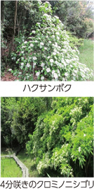 見た目がよく似ているサワフタギとクロミノニシゴリ(ハイノキ科)は、落葉低木で山地の沢や湿地など湿り気のある所に生育すると言われています。開花は5月~6月で、サワフタギの方が少し早く白色の小さな花が咲きます。サワフタギは沢をふさぐように生えるのが和名の由来と言われており、葉にざらつきがあり、果実は瑠璃色に熟します。一方、クロミノニシゴリの果実は黒く熟します。また、開花時期には葉を好んで食べる幼虫が育ち、葉を丸めてさなぎ(繭の中)になり羽化したシロシタホタルガがたくさん飛び出していきます。