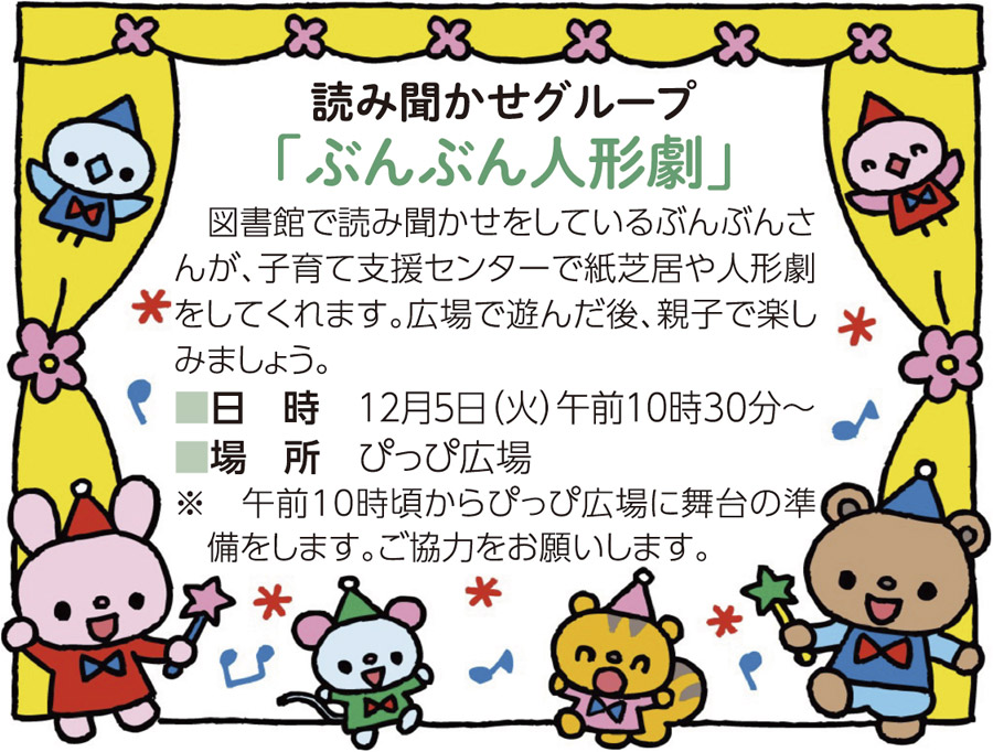 ◆「ぶんぶん人形劇」当日は、午前10時まで平常通り広場で遊べます。午前10時以降からは舞台の準備をしますので、場所の移動をお願いする場合があります。ご理解、ご協力をお願いします。