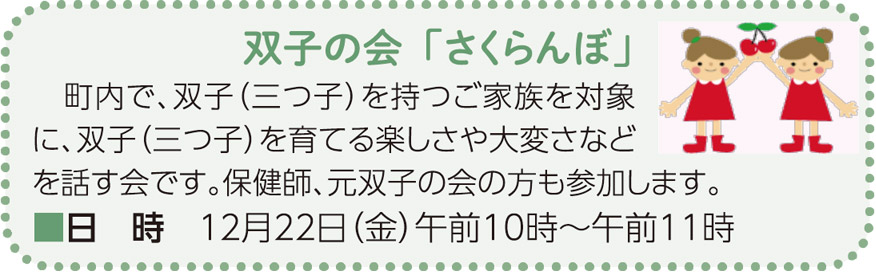 | 22 | (金) | ●双子の会「さくらんぼ」 午前10時~午前11時 | |