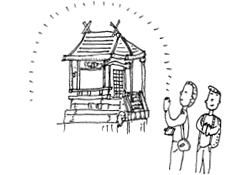背の高い木が何本も立ち並ぶ“鎮守の森”に足を踏み入れる。社などが建つ境内までの空間は昼間でも薄暗い。長い石段の先に、明るく照らし出されたスポットが見える。その空間に多くの神が
