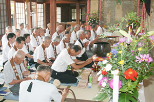 虫供養行事の一環として行われる「土用干し」が7月29日、興昌寺(福住)でありました。当日は厳しい暑さになりましたが、町指定文化財の12幅の掛け軸などが飾られた会場には、先導する導師の声や同行衆の唱和する百万遍念仏が響いていました。