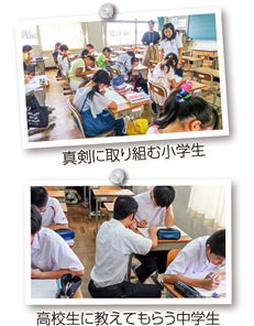8月28日から29日までの2日間、中学校でサマースクールを実施しました。町内の小学6年生と中学生の希望者が、夏休みの宿題や苦手な教科の学習に取り組みました。中学3年生の中には受験勉強に取り組む生徒もいました。このサマースクールは、小学6年生が翌年に入学する中学校の教室で実際に学習に取り組む機会を作ることで、中学校入学を意識させ、学習に対する意識と意欲を高めることを目的としています。そのため、小学校の45分授業ではなく、中学校の50分授業で2時間の学習に取り組みました。一人一人が自分で学習に取り組みますが、各教室には地域の方・教員志望の学生(普段は町内小中学校で活躍する学校支援ボランティアやサタデースクールの講師)、そして阿久比高校の生徒が講師として入り、分からないところを教えました。昨年度は、小学生56人、中学生28人の参加がありました。