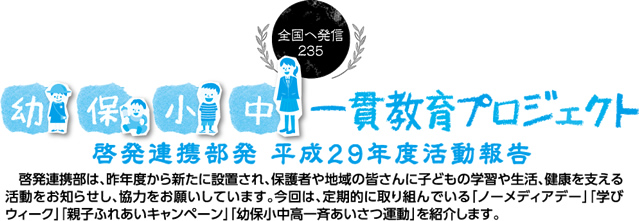 「ノーメディアデー」当日に、保健委員会の児童・生徒が放送で知らせたり、各学級で連絡帳に記入したりするなど各校ごとに工夫して啓発しています。保護者へは、緊急時用に登録されているメール配信システムを活用して協力を呼び掛けています。