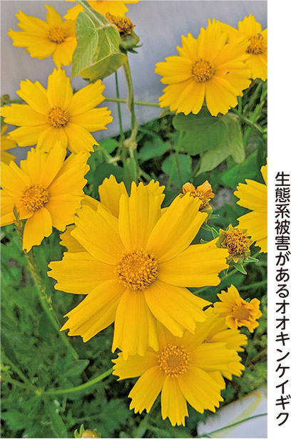 環境省の特定外来生物に指定されているオオキンケイギクは、5月頃に咲くコスモスに似た美しい花であるが、大変強い繁殖力を持ち、在来植物を駆逐する。