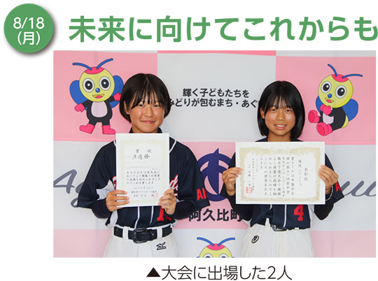 第25回全日本中学校女子ソフトボール大会に出場した近藤ななみさん(阿久比中3年)、尾迫ななみさん(阿久比中1年)が町長を表敬訪問し、結果を報告しました。大会はベスト16で終了し一息をつく2人。近藤さんは「全国の舞台はとても緊張した。今後もソフトボールを続けていく」、尾迫さんは「全国のレベルはとても高かった。これからも頑張っていきたい」とそれぞれ感想と決意を述べました。