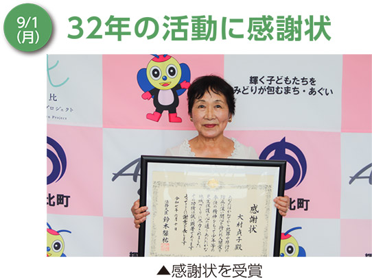法務大臣感謝状を受賞した阿久比更生保護女性会会員の大村貞子さんが町長を表敬訪問しました。大村さんは「周囲の皆さんに恵まれて続けることができた。忙しくて大変なこともあったけれど、楽しい時間でした」と振り返り、受賞の喜びを語りました。