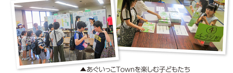 中央公民館でこどものまちあぐいっこTownが開催されました。受付には行列ができ、ハローワークで仕事を探して働くたくさんの子どもたちの姿も。給料を通貨「あぐ」で受け取ると、お店を巡って買い物をしたりゲームコーナーで遊んだりして楽しみました。