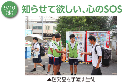 9月10日~16日の自殺予防週間にあわせて、町自殺対策推進協議会委員や阿久比中学校有志の皆さんが阿久比駅などで啓発活動を行いました。早朝から集まった皆さんは、通勤や通学の駅利用者へ、啓発品を手に呼び掛けました。