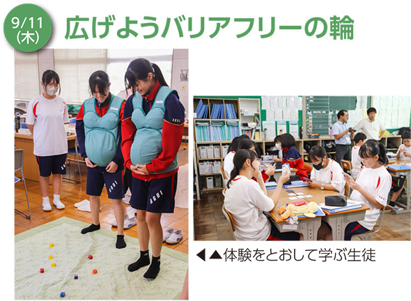 阿久比中学校で1年生を対象に福祉実践教室(主催 社会福祉協議会)が開催されました。グループに分かれて、手話や点字を学んだり、車いすや妊婦の体験をしたりしました。最初は戸惑う様子もあった生徒たちも、実際に障がいのある講師から話を聞くことで理解を深め、自分たちにできることについて考えていました。