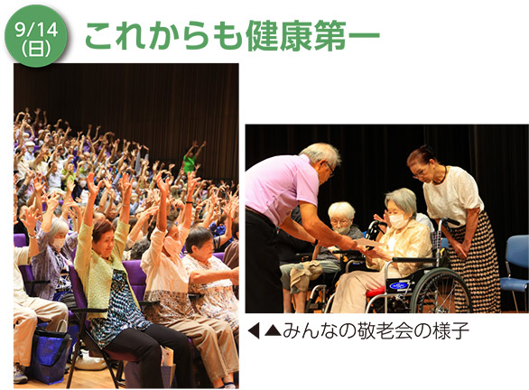 長寿と健康を祝ってアグピアホールでみんなの敬老会を開催しました。当日は町内に住む70歳以上の高齢者が集まり、互いの健康を喜び合う姿がありました。健康体操や尾張漫才の出し物もあり、来場者は舞台に向かって拍手をしたり一緒に体操したりして楽しみました。