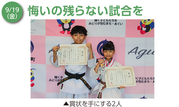 第25回全日本少年少女空手道選手権大会に出場した兄妹の及川健太さん(東部小4年)と葵子さん(東部小2年)が町長を表敬訪問しました。形部門でそれぞれ出場した2人は、今後も練習に励みたいと報告。健太さんは「自分の納得いく試合をして後悔しないように取り組みたい」と話し、葵子さんは「表彰台の一番上に登りたい」と続けました。
