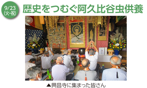 今年は福住地区で開催された伝統行事の虫供養。この日のために準備を整えてきた地区の皆さんは、自然の恵みに感謝しながら一心に念仏を唱えました。町指定有形民俗文化財の掛軸が並び、かねや太鼓が鳴り響く様子が約900年続く伝統を物語っていました。