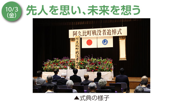 アグピアホールで戦没者追悼式を開催しました。参列者は黙とうをささげた後、平和への思いを胸に献花を供えました。改めて日常を振り返り、穏やかに過ごすことのできる日々に感謝するひと時となりました。