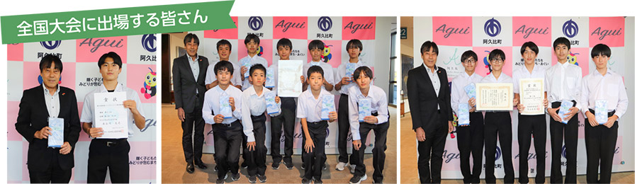 JOCジュニアオリンピックカップに出場する阿久比中学校陸上部員と、第43回全日本ジュニア新体操選手権大会に出場する新体操部の皆さんが表敬訪問しました。代表選手が抱負を語り、大会に向けての士気を高めていました。