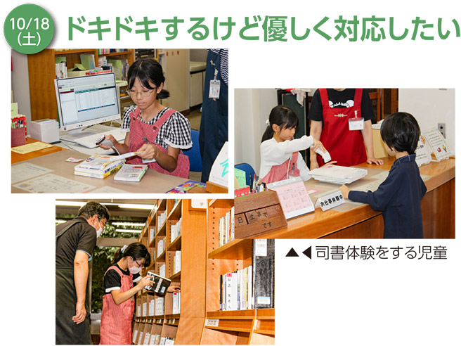 本に親しみ、図書館に関心を持ってもらおうと読書週間事業「あなたも図書館司書」を実施しました。抽選で選ばれた児童は、エプロンを付け名札を胸に仕事を開始。本の貸出や返却、装丁作業を体験しました。最初は緊張していた挨拶も、時間が経つごとに元気に丁寧に声を掛けることができるように。体験後には「大変だったけど楽しかった」と達成感と共に感想を述べました。