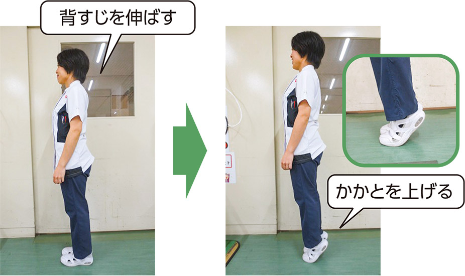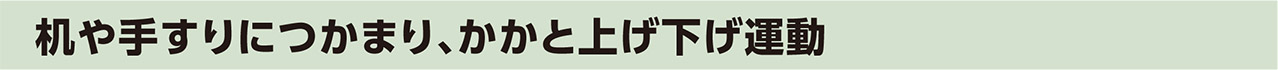 足を肩幅に広げます。不安定な方は机や手すりにつかまり、背すじと両膝をしっかり伸ばし、かかとを上げ下げします。