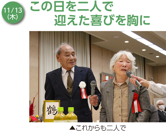 ダイヤモンド婚者・金婚者お祝いの会がエスペランス丸山(勤労福祉センター)で開催されました。参加した皆さんは長年連れ添った相手へ「これからもよろしく」と笑顔で声を掛け合い、二人でこの日を迎えらえた喜びをかみしめました。