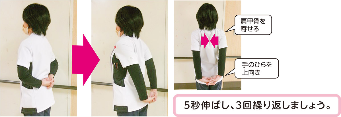 手のひらを上向きで組み、床に向かって手を伸ばし、肩甲骨を内側に寄せます。
