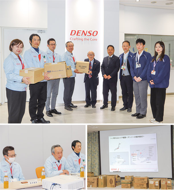 デンソー阿久比製作所とデンソーウェーブから町社会福祉協議会に食料約150キロの寄贈を受けました。集まった食料と、困っている人のために使ってもらえたらという願いも詰まったたくさんの箱が手渡されました。