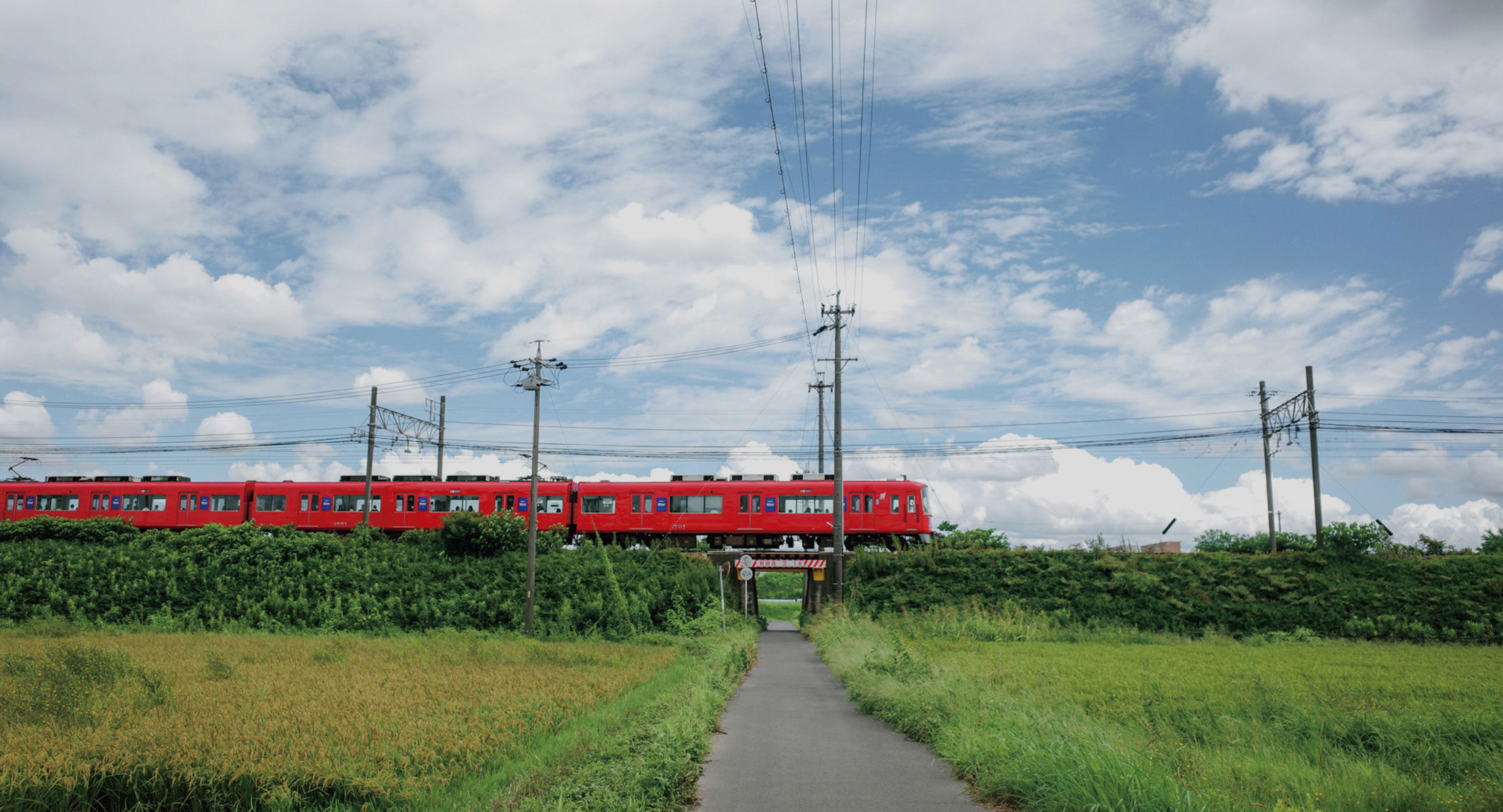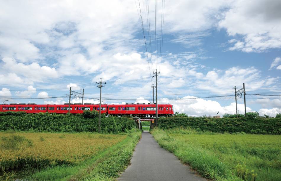 名鉄電車が走る田んぼを挟んで向こうとこっちがある阿久比町。
