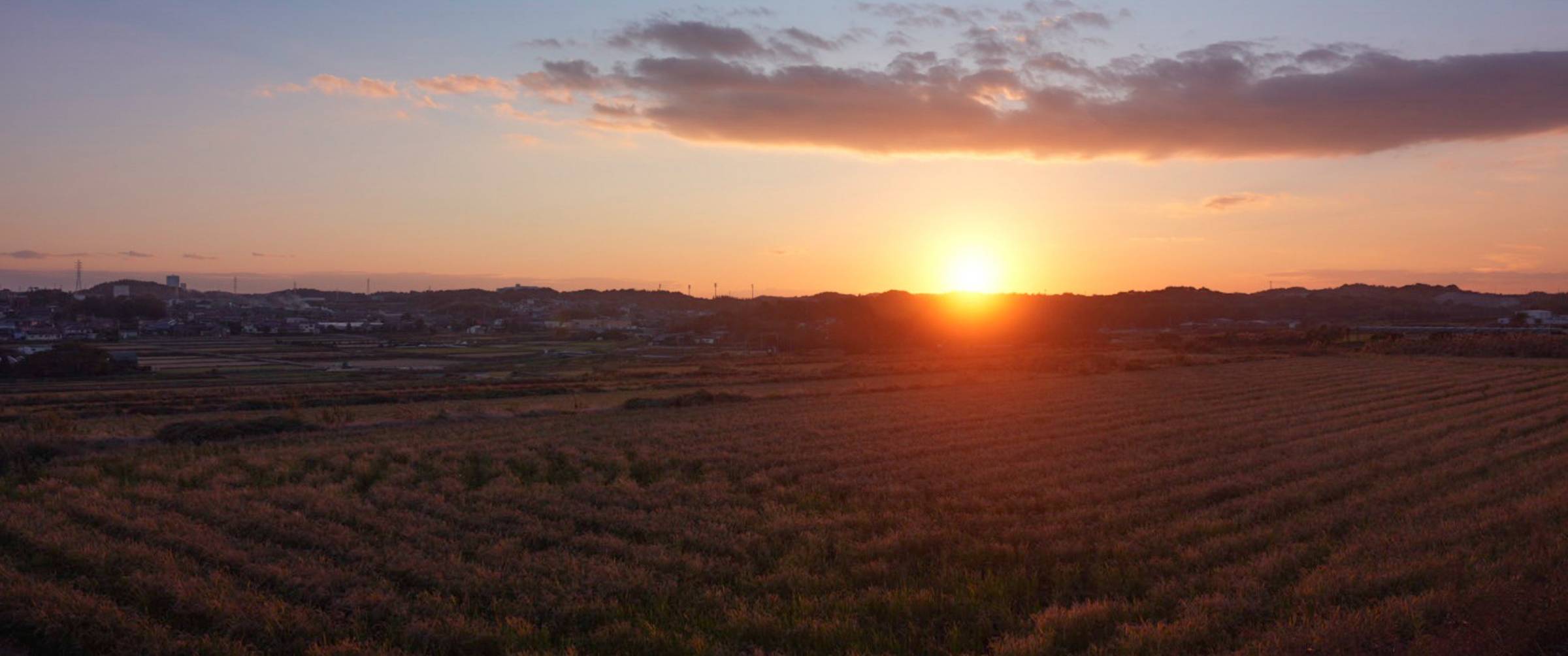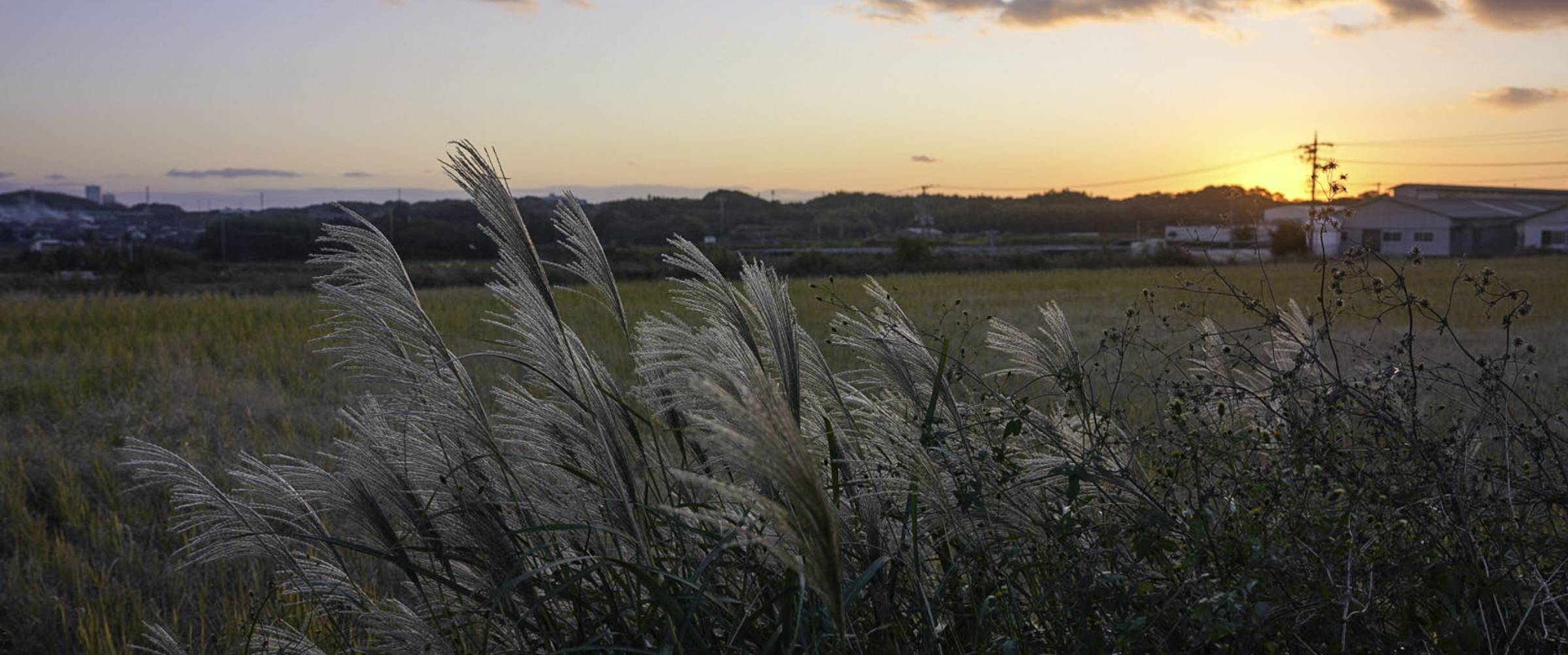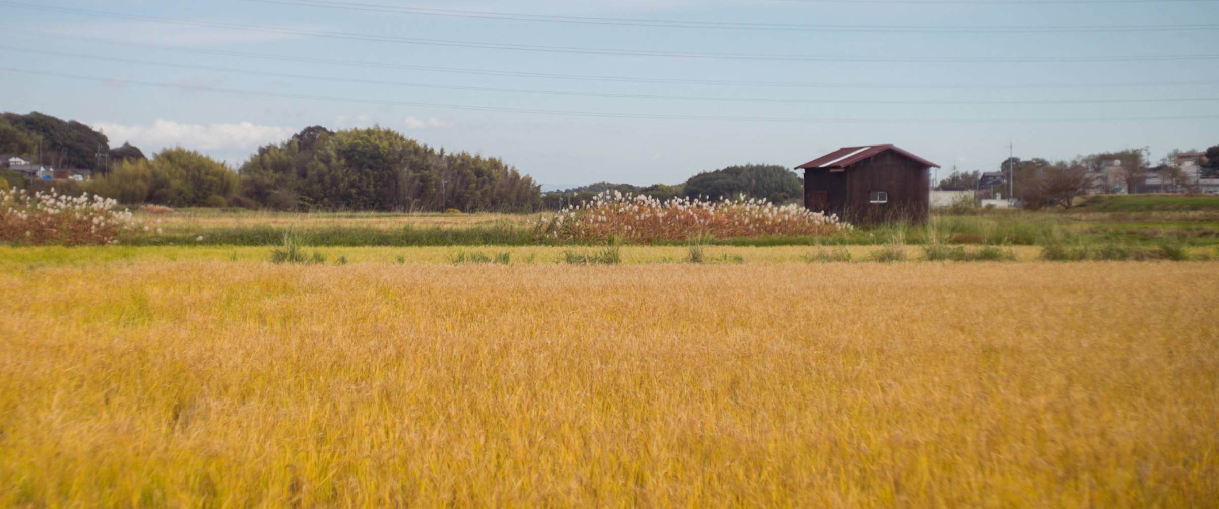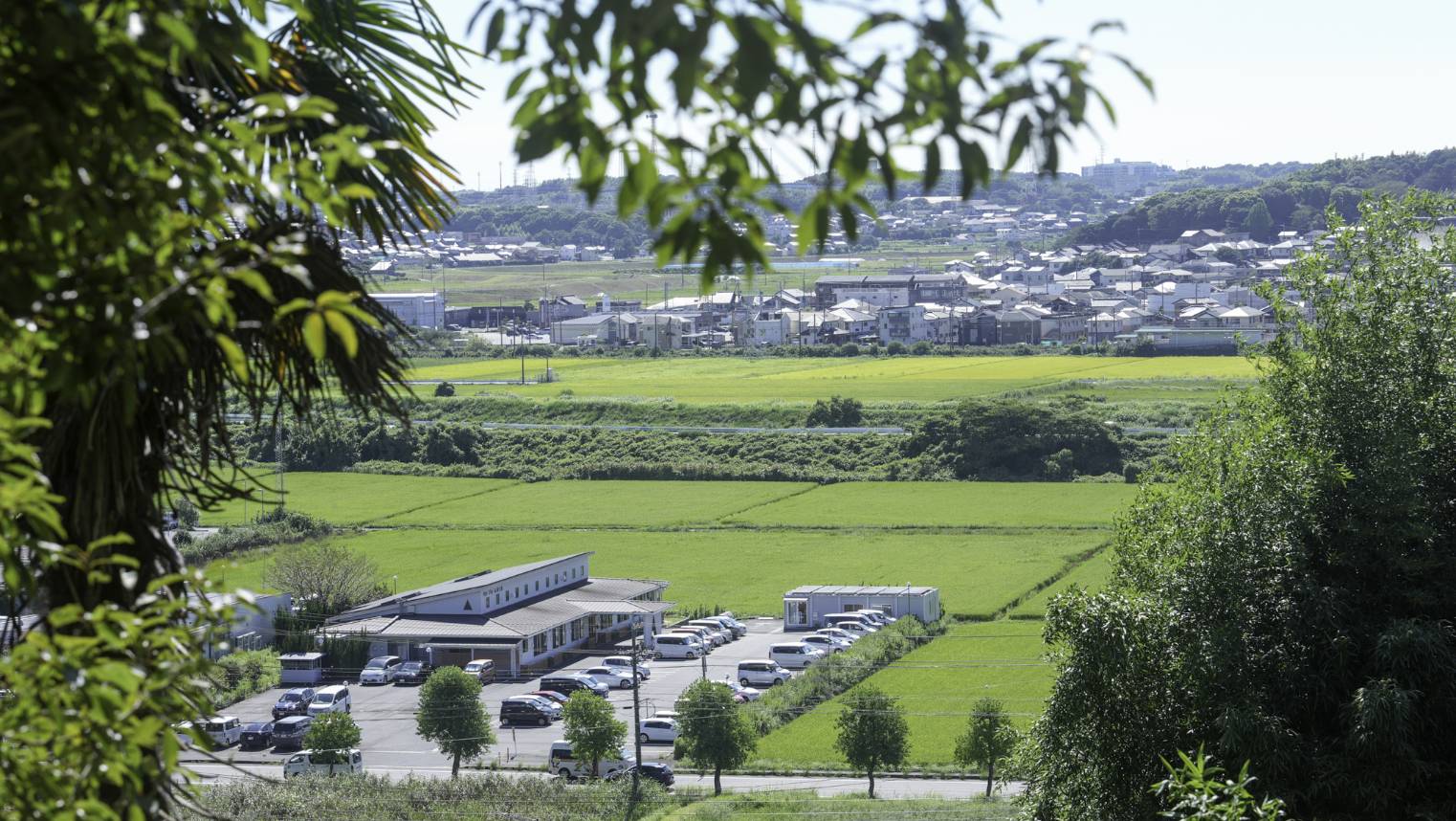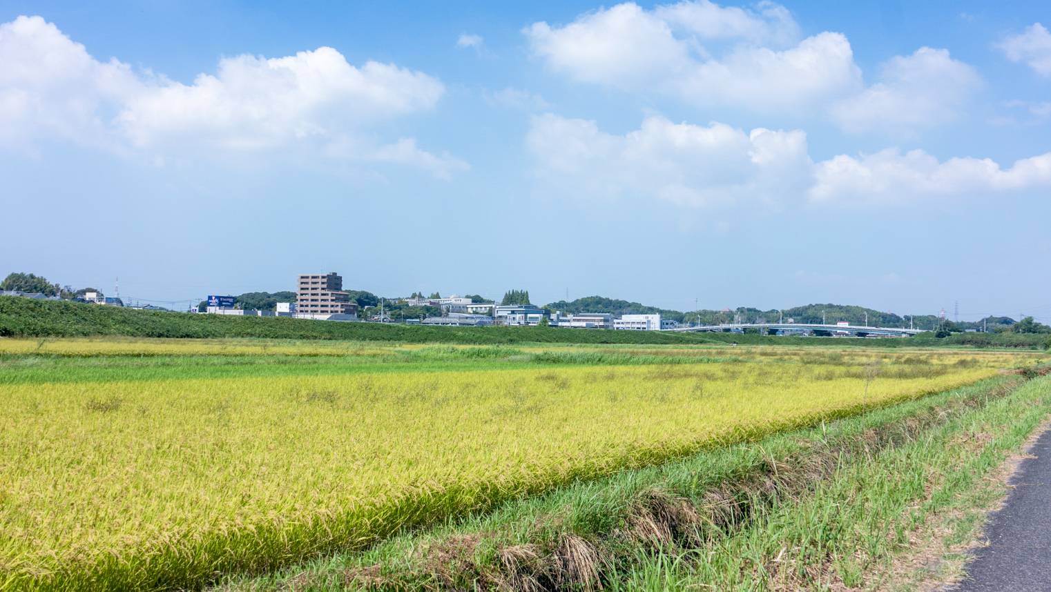 名古屋から名鉄の赤い電車で、河和行きに乗り、外の景色を眺めていると、巽ケ丘駅を過ぎたあたりで、パーっと視界が開ける瞬間がある。町並みから、空と緑が広がる風景へ。線路沿いの川が町の中心を南北に流れ、左右には田園、その先の低い丘沿いに、民家や団地、段々畑、寺社が目に映る。どこか懐かしくて、町民にとっては、「ふるさとに帰ってきた」と、実感する瞬間でもある。阿久比駅で下車して東側に出ると、未舗装の道沿いに田んぼと土手がある。電線がなく、空との境がくっきりと美しい。そこにはすでに「あぐいらしい風景」が広がっていて、時間がゆっくり進むように感じる。