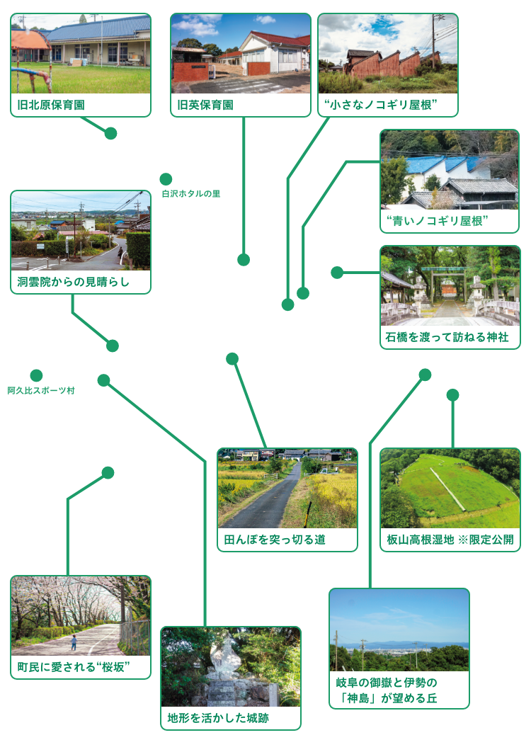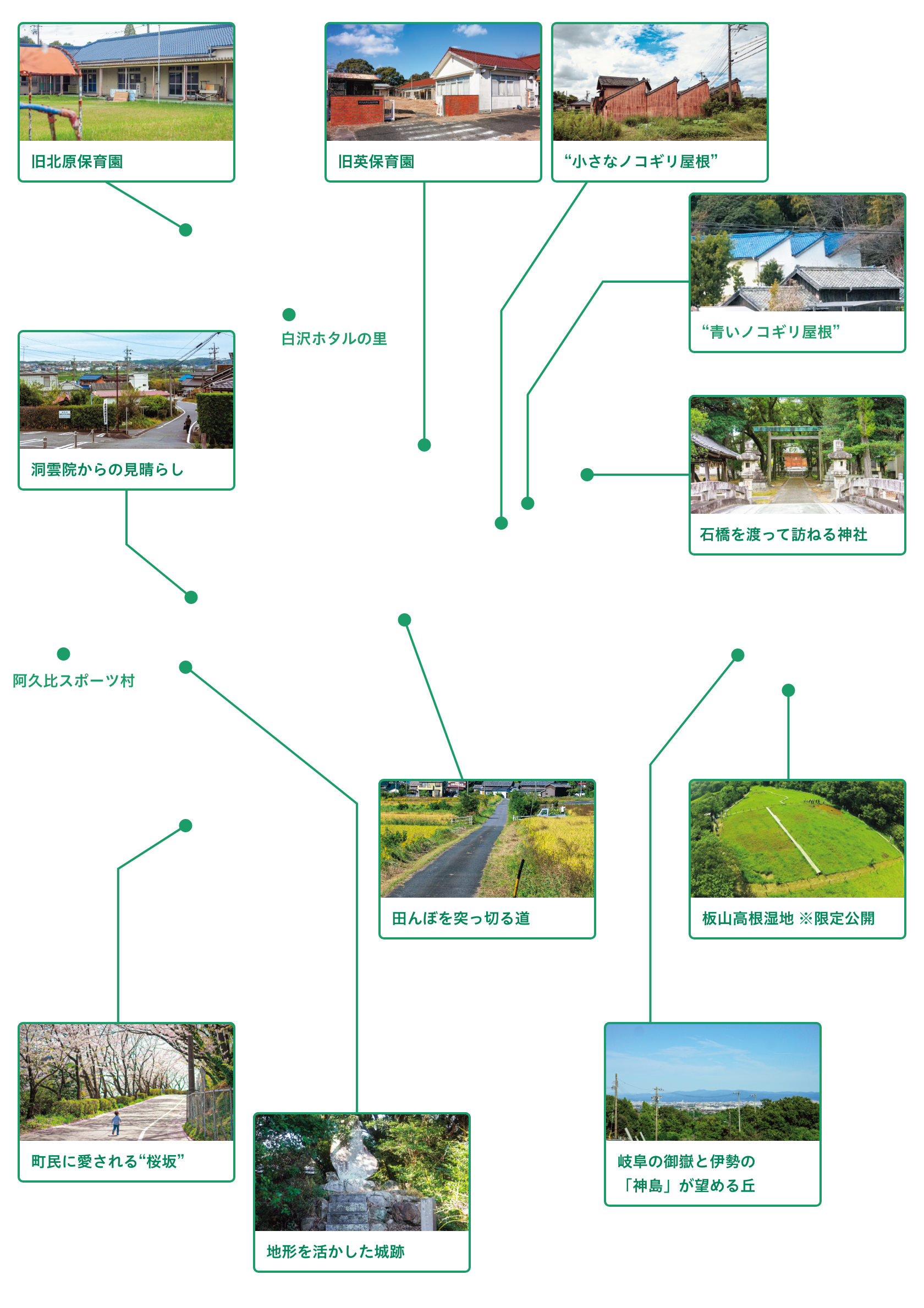 坂部の洞雲院は、於大の方の墓地があることで知られているが、眺めもよく、「田園風景を一望できておすすめ」と元田さん。板山の熊野神社へ向かう道には、あせた茶色の壁のノコギリ屋根や、白い壁に青い瓦が珍しいノコギリ屋根、牛舎などが残り、夕暮れが似合う。白沢の北原天満宮では「英比の名の由来は、ここに菅原道真を祀った孫の英比麿から来ているらしいです」と中西さん。ふるさとの歴史を自然に語る姿に、町への愛着を感じた。