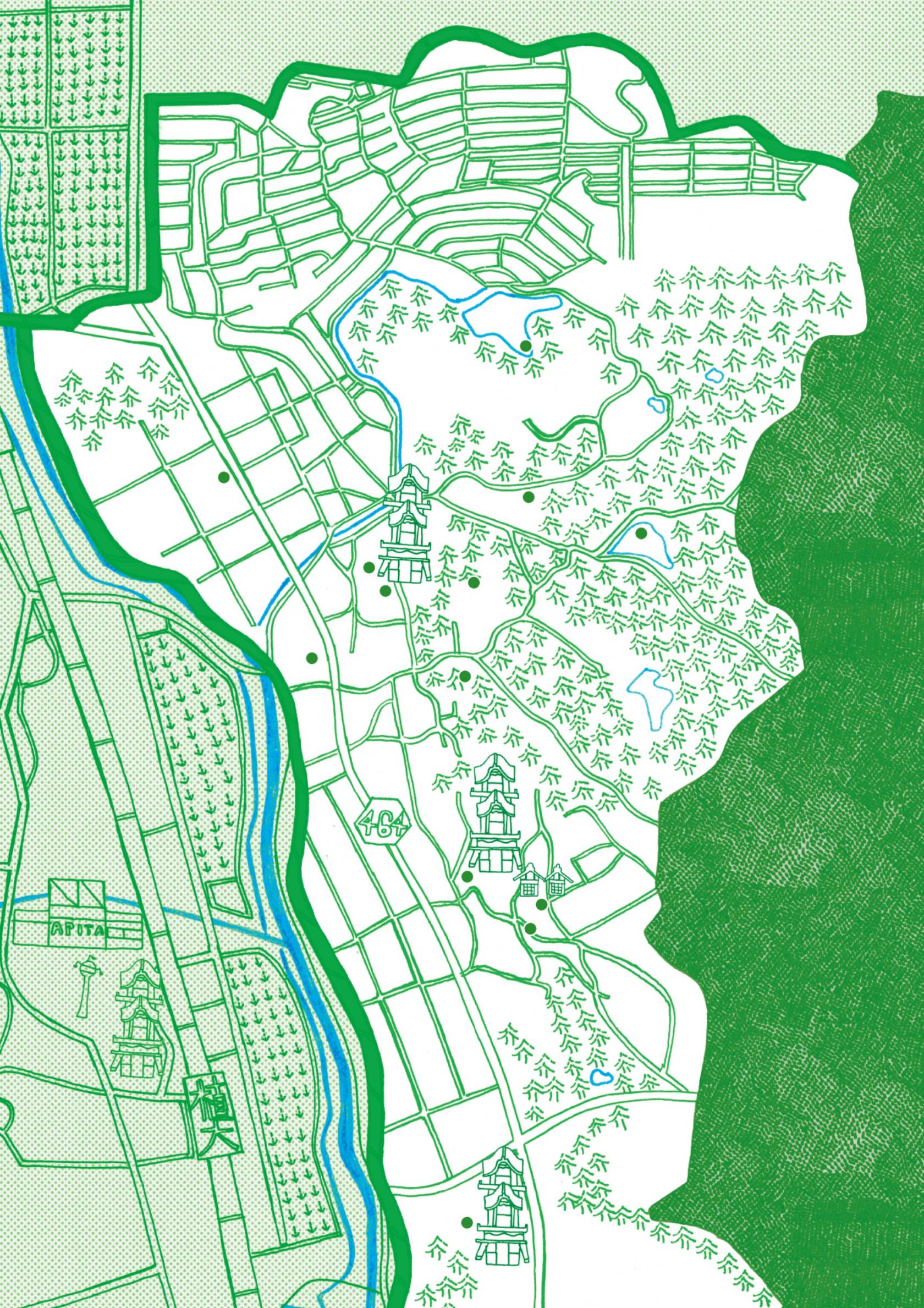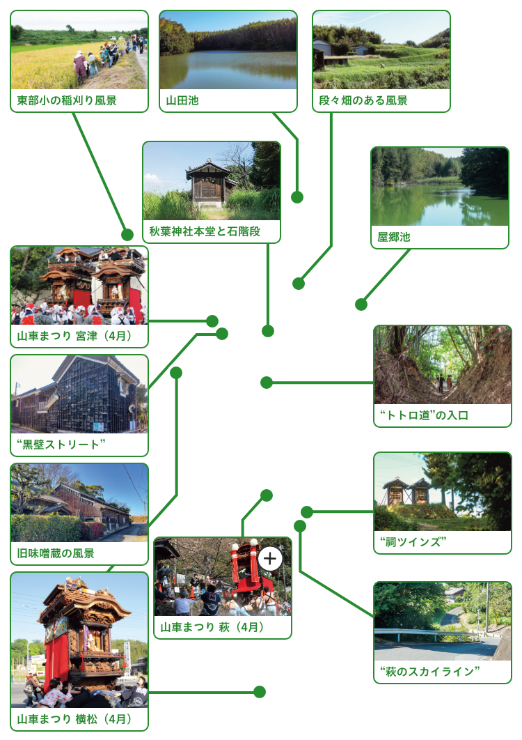 地図アプリにもない小道を抜け、たどり着いたのは、野生の鴨が泳ぐ静かなため池や、山神を祀る祠。秋葉さんおすすめの場所だ。谷性寺周辺も探検したくなる小道が多い。矢野さん一家の通称〝トトロ道〟は、木々がトンネルのように覆う里山を登る細い道(狸を見かけたこともあるとか)。萩の丘の小道からは「西側の丘が、対岸の島に見えるんです」と美佳さん。稲穂の波が広がる上を、赤い電車がコトコト横切る姿と音もアニメ映画のワンシーンのようだ。