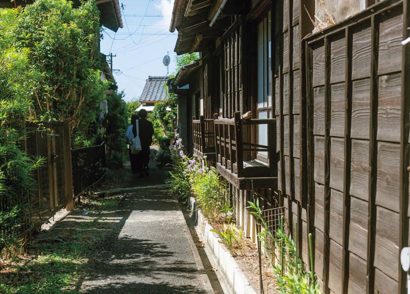 「阿久比川に海が入り込んでいた頃の史跡もあるのよ」と秋葉さん。このエリアには西側の阿久比川沿いに田んぼが広がり、学校や住宅地など生活拠点のある東側には知多木綿の工場や旧味噌蔵といった産業の跡も残る。「宮津には酒屋や洋品店などの商店が連なるメイン通りもあったんです」と晋空さん。今もコールタールで塗られた黒板塀や壁の風情が所々で見られる。